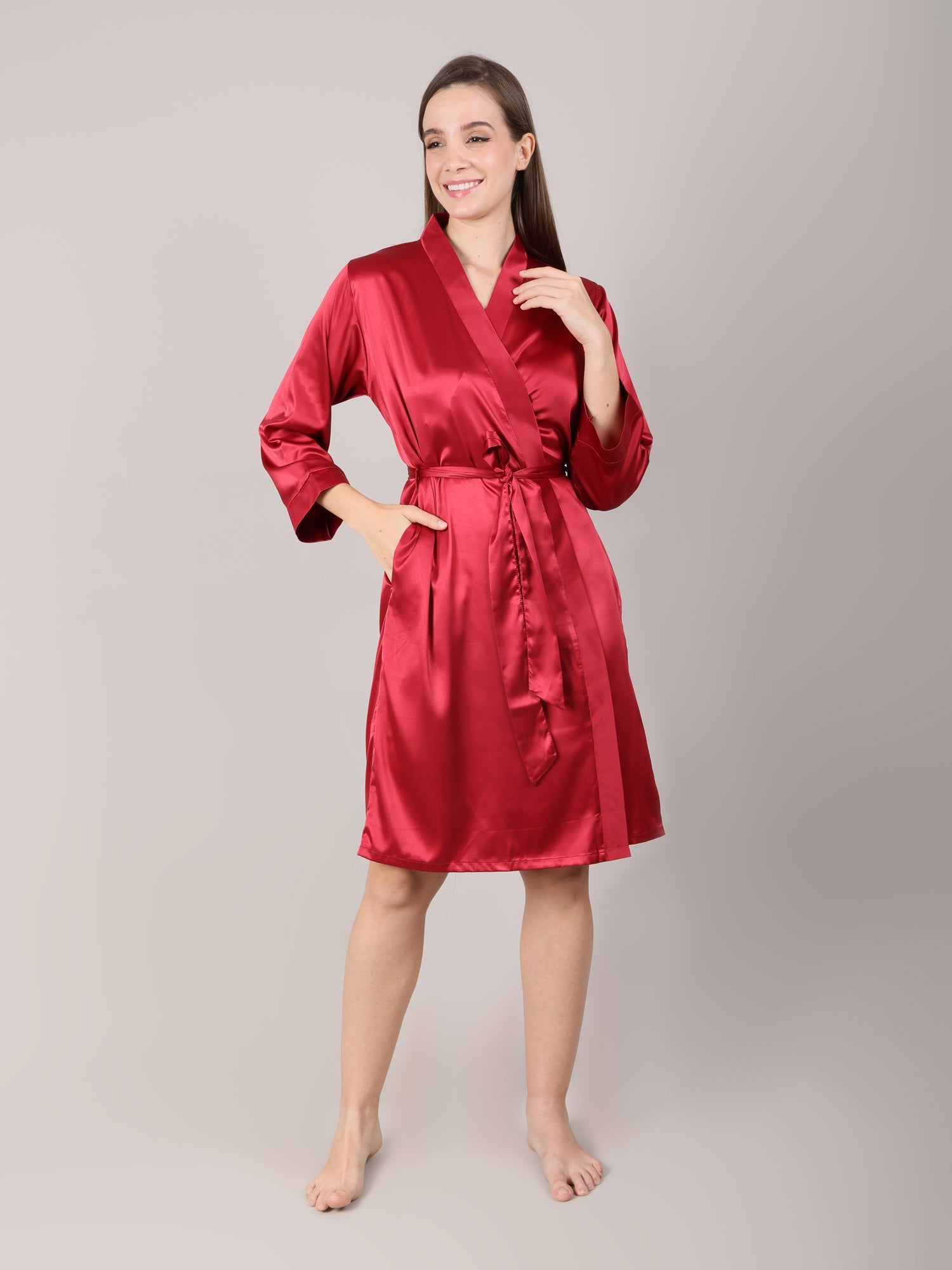 - Women's luxe satin robe in maroon color. Comfortable, sylish and versatile, this night robe comes with a deep pocket and a long wrap around belt.